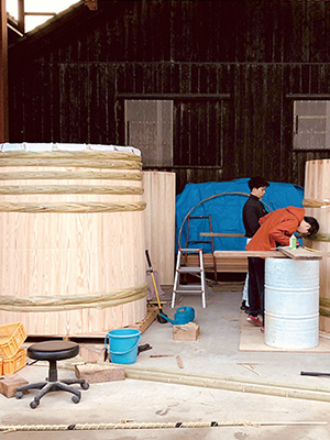 Yoshino wood is “a straight-grained wood with few knots and dense annual rings,” properties that prevent liquids from leaking out. For this reason, it has been widely used for making sake barrels since the 1700s. High-quality sake from the Kamigata region (modern day Kyoto-Osaka area) was stored in Yoshino cedar sake barrels to be transported by ship to Edo (modern day Tokyo). During the storage, the scent of cedar wood would seep into the sake, giving it a unique scent and taste, which was particularly appreciated by the residents of Edo.